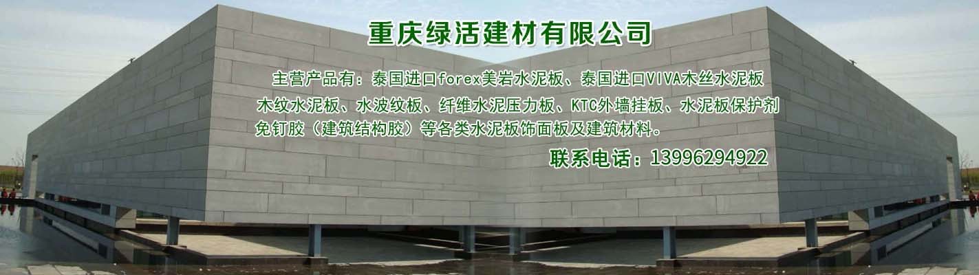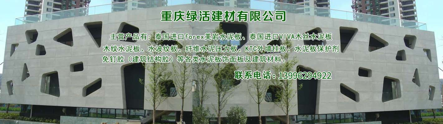 重慶綠活建材有限公司專業經營國內外建筑裝飾材料及防火、防水、隔音的綠色環保材料,其主營產品有:泰國進口forex美巖水泥板,泰國進口VIVA木絲水泥板,木紋水泥板,水波紋板,木絲吸音板,高密度纖維水泥板,KTC外墻掛板,水泥板保護劑,免釘膠(建筑結構膠)等各類水泥板飾面板及建筑材料。 本公司秉承“以服務為宗旨,以誠信為本,合作至上為經營原則”的管理理念,全力打造產品質量品牌,客戶服務品牌。并致力于國內外建材類產品的新工藝、新技術、新產品的引進與推廣,不斷追求高品質,以卓越、優質的產品回饋社會各界的信賴與支持。